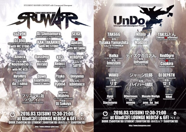 Gladフロアには「STUDENT RAVERS UNITED!!」通称SRUによるB2Bオンリーイベント「STUDENT RAVERS UNITED!! WARS」!