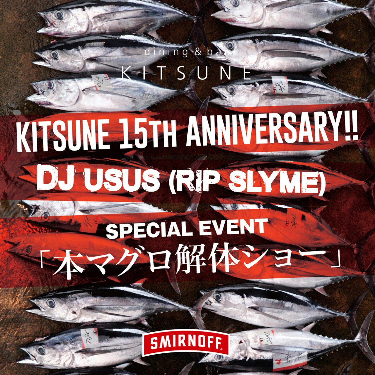 渋谷・恵比寿の中間地点、アバンギャルドな寿司や和食・フレンチのフュージョンメニューを提供する「dining & bar KITSUNE」が、この度オープン15年を迎えることとなりました。15年という長きにわたり営業を続けて来られたましたのも偏に皆様のご愛顧によるものと感謝申し上げます。感謝の気持ちを込めまして寿司・ブッフェ食べ放題と本マグロの解体ショー、「DJ usus」こと、人気ヒップホップグループ「RIP SLYME」の低音担当「SU」によるDJプレイをお楽しみいただける企画をご用意いたしましたのでぜひご来場ください。今後後ともdining & bar KITSUNEを宜しくお願い致します。