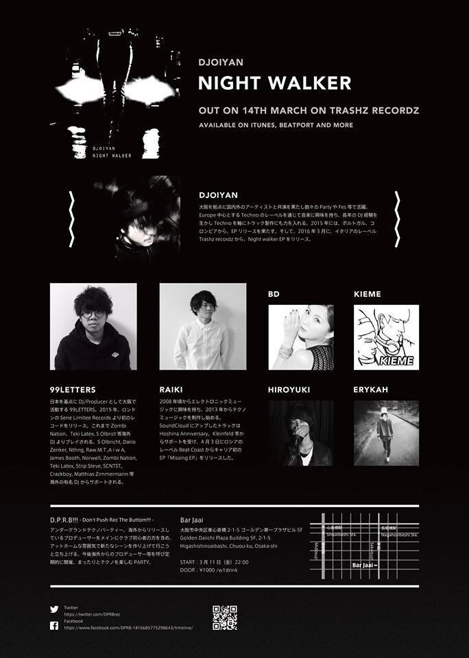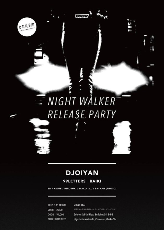 アンダーグランドテクノパーティー。海外からリリースしているプロデューサーをメインにクラブ初心者の方を含め、アットホームな雰囲気でテクノを楽しむPARTY。今回は、DPRBクルーである、Djoiyanが3月14日にイタリアのレーベルTrashz Recordzから(NIGHT WALKER EP)リリース決定。99LETTERS, Raikiと共にDPRB x Djoiyan(EP RELEASE PARTY)として開催致します。