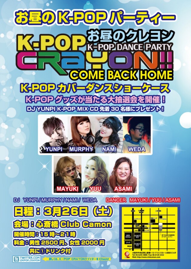 【CRAYON -Come Back Home-】3/26(土)☆お昼のクレヨン『CRAYON -Come Back Home-』開催決定☆☆K-POP好きはもちろんクラブ初心者の方も楽しめるクレヨン★★曲は全て映像付きでお送りします☆☆CLUB CAMONのLINE公式アカウント登録で割引特典あり★★