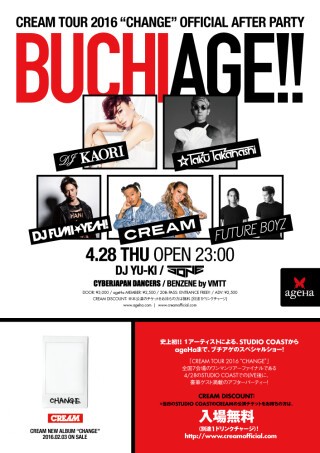 そんなCREAMがワンマンツアーのファイナルである、4/28のSTUDIO COASTでのLIVE後に、そのままageHaで、豪華ゲスト満載のアフターパーティーを開催することが決定した。