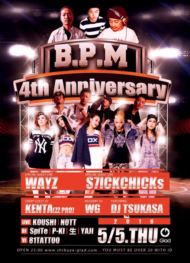 DJ WG主催2ヶ月1回に渋谷Gladにて開催の『B.P.M』!!EVERY GUEST DJとしてHipHopの競争率の高い”横浜”を中心に絶大なる支持とキャリを持つ”DJ KENTA”を迎え平日の渋谷に化学反応を起こします!都内人気大箱を中心に活躍する”DJ TSUKASA”のfeaturingやヘビー級のHipHop PARTYにて人気を誇る凄腕レギュラーDJ陣の出演により音好きのヘッズだけではなくクラブファンも来るPARTYに!!今回4周年の節目を迎え、更なる進化をし、入場無料,飲み放題のコンセプトに立ち向かい”音勝負”のPARTY!新旧問わずGOOD MUSICオンリーをお届けします!