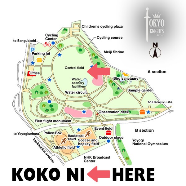 We will be in the Central field of Yoyogi Park. Please view the map for our exact location. Also if you get lost you can try finding us by listening for the music, or looking for the sign that says "MAP, Tokyo Knights, Tokyo Nightlife".