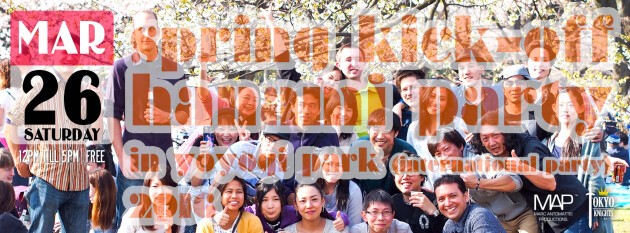 Last year we all got together, had fun, drank beer, ate food, and took photos. It was a good time! Now it's time to do it all over again. We will host a large international get together party at Yoyogi Park in Shibuya-ku to celebrate the arrival of spring and sakura (hanami) season.