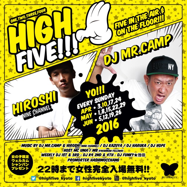 毎週日曜日に京都のベテランDJ Mr.CAMPとレゲエサウンドNINE CHANNELのHIROSHIによるNewパーティー"High FIVE !!!"がスタート!!
