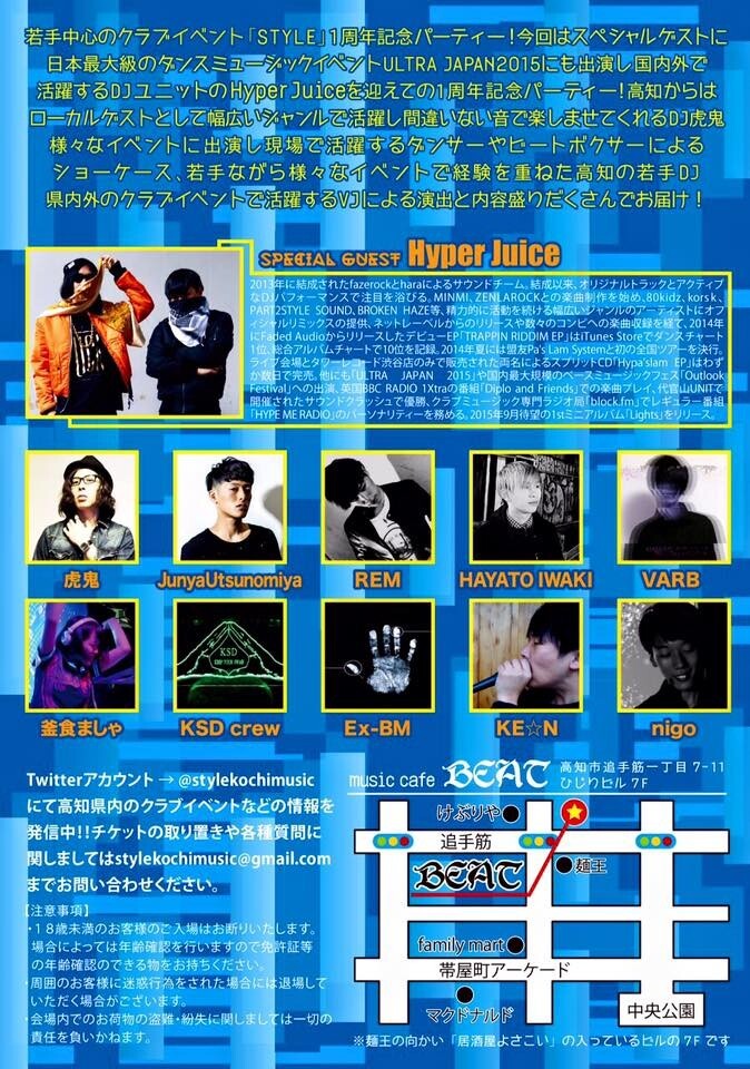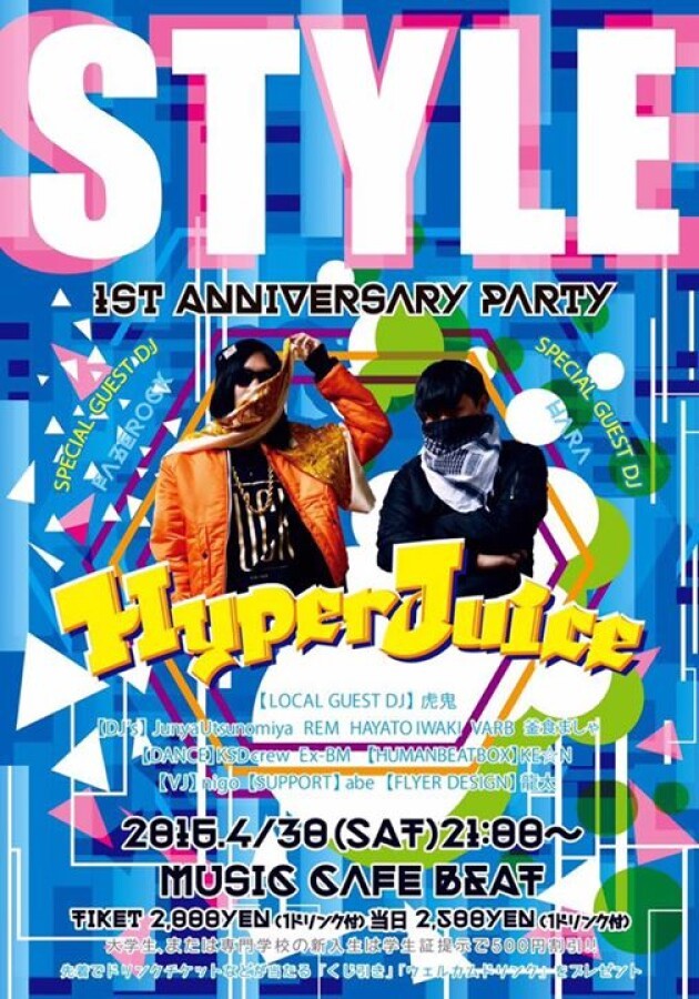 若手中心のクラブイベント「STYLE」1周年記念パーティー! 今回はスペシャルゲストに、日本最大級のダンスミュージックイベントULTRA JAPAN 2015にも出演し、国内外で活躍するDJユニットのHyperJuiceを迎えての1周年記念パーティー!