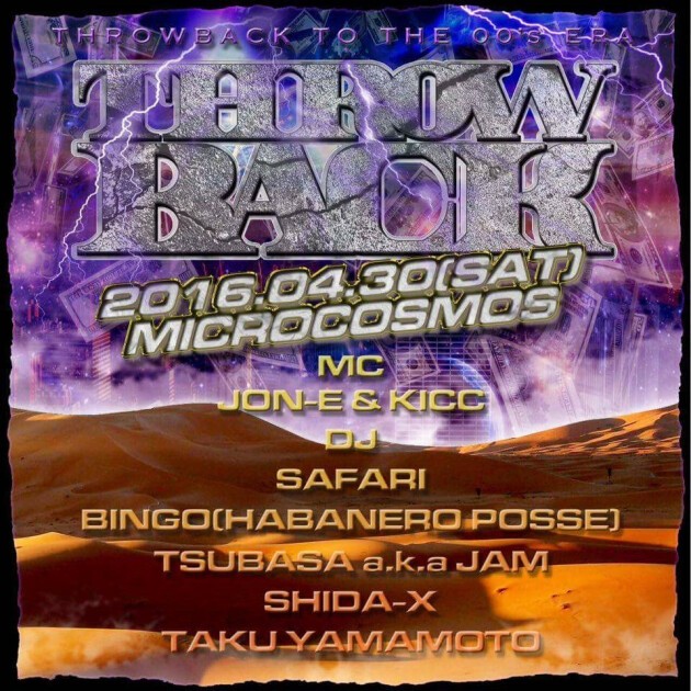 時は2000年代初頭、ヒップホップは音楽、ファッション等様々な側面で大きな変貌を遂げていった。今もなお色褪せない当時のクラシックはダンスフロアを 揺らし続けている。そんな新たな黄金期といえる時代にフォーカスしたパーティーがここミクロコスモスで開催される。DJにはベテランから若手までその日限 りのセットを用意したスペシャリスト達が集結。ライブにも確かなスキルを持つアーティスト達が参戦。そして当日は当時のアイテム等を展示しまさにその時代 の雰囲気を演出します。是非みなさん4/30はミクロコスモスへあの時代にタイムスリップしにきてみませんか?