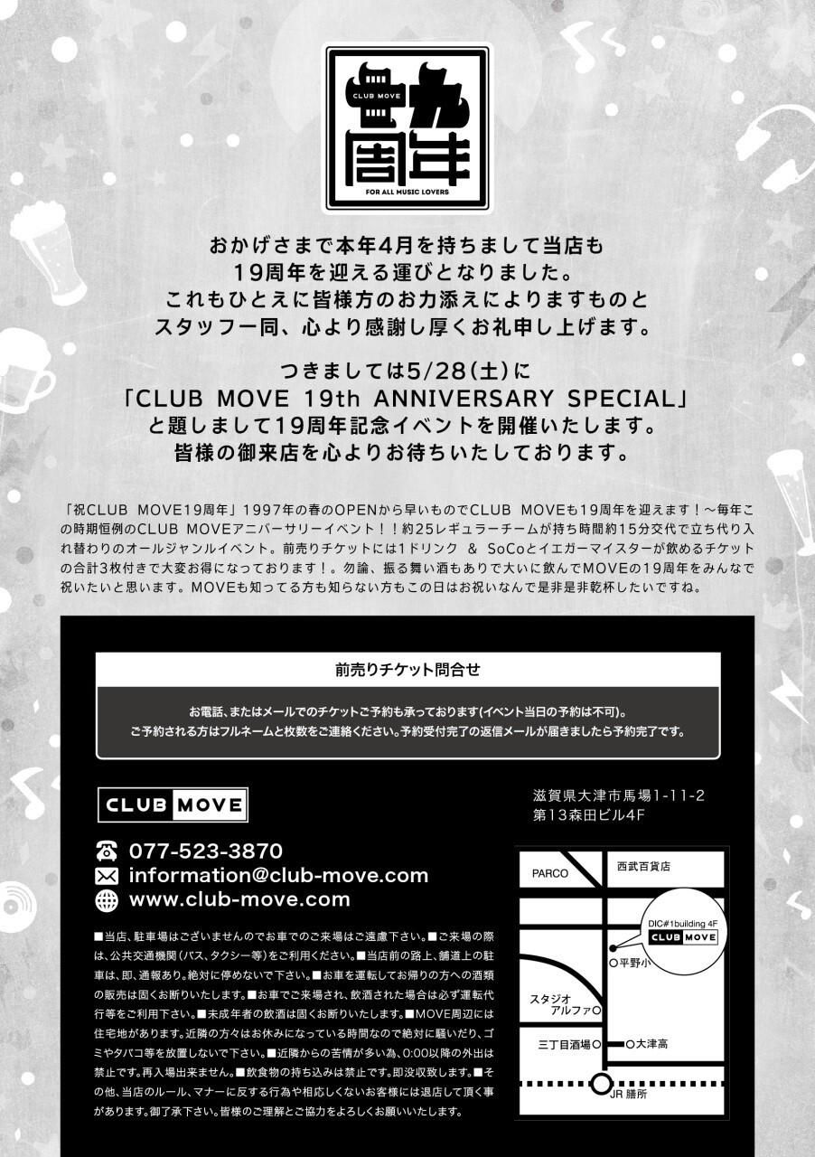 つきましては5/28(土)に『CLUB MOVE 19 th ANNIVERSARY SPECIAL』と題しまして19周年記念イベントを開催いたします。