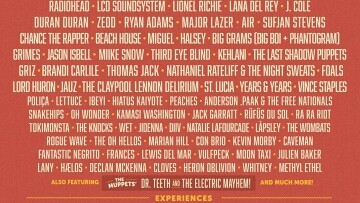 RADIOHEAD •LCD SOUNDSYSTEM •LIONEL RICHIE •LANA DEL REY •J. COLE •DURAN DURAN •ZEDD •RYAN ADAMS •MAJOR LAZER •AIR •SUFJAN STEVENS •CHANCE THE RAPPER •BEACH HOUSE •MIGUEL •HALSEY •BIG GRAMS (BIG BOI + PHANTOGRAM) •GRIMES •JASON ISBELL •MIIKE SNOW THIRD EYE BLIND •KEHLANI •THE LAST SHADOW PUPPETS •GRIZ •BRANDI CARLILE •THOMAS JACK •NATHANIEL RATELIFF & THE NIGHT SWEATS •FOALS •LORD HURON JAUZ •THE CLAYPOOL •LENNON DELIRIUM •ST. LUCIA •YEARS & YEARS •VINCE STAPLES •POLIÇA •LETTUCE •IBEYI •HIATUS KAIYOTE •PEACHES ANDERSON .PAAK & THE FREE NATIONALS •SNAKEHIPS •OH WONDER KAMASI WASHINGTON •JACK GARRATT •RÜFÜS DU SOL •RA RA RIOT TOKIMONSTA •THE KNOCKS •WET •JIDENNA •DIIV •NATALIA LAFOURCADE LÅPSLEY •THE WOMBATS •ROGUE WAVE •THE OH HELLOS •MARIAN HILL CON BRIO •KEVIN MORBY •CAVEMAN •FANTASTIC NEGRITO •FRANCES LEWIS DEL MAR •VULFPECK •MOON TAXI •JULIEN BAKER •LANY •HÆLOS DECLAN MCKENNA •CLOVES •HERON OBLIVION •WHITNEY •METHYL ETHEL •THE MUPPETS’ DR. TEETH AND THE ELECTRIC MAYHEM...