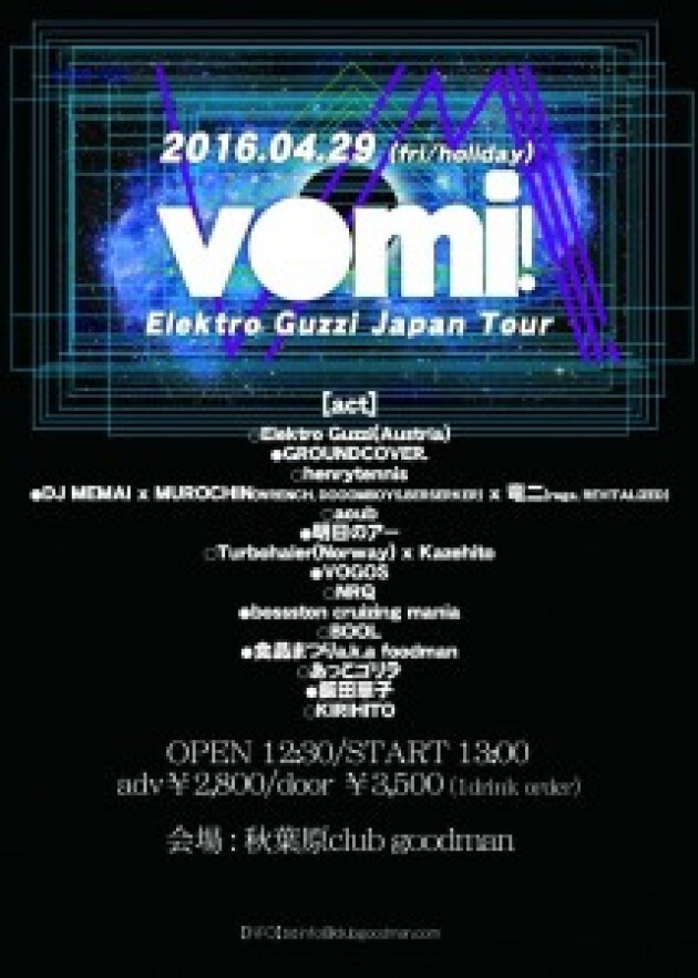 オーストリアはウィーンからの使者”Elektro Guzzi”の来日にかこつけて発足した、全く新しいアンダーグラウンド・パーティー<<vomi!>> 全ての思考を開放してダダモレのままお楽しみください。