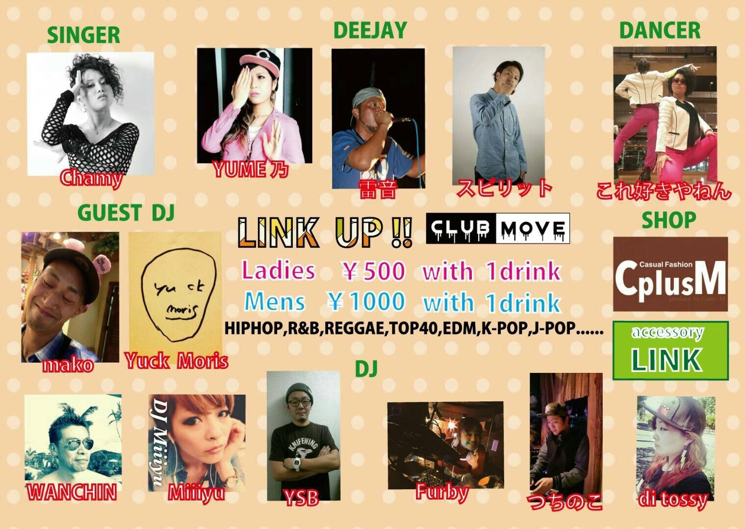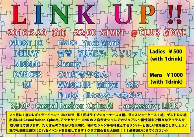 2ヶ月に1度のレギュラーイベントLink up!! LIVEありDANCE SHOWCASEあり、出店には "Casual fashion CplusM"にアクセサリー "LINK" がオシャレでカジュアル~個性派まで様々なアイテムを取り揃えております。
