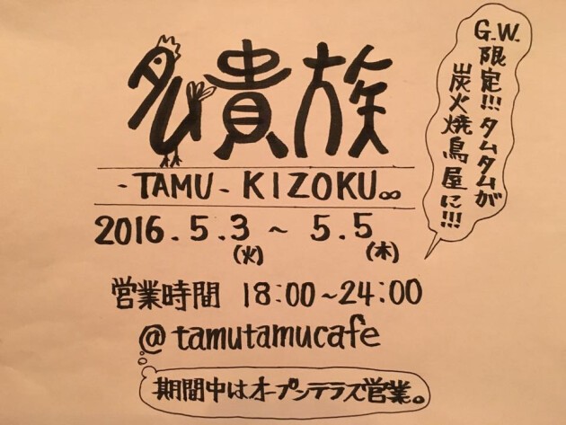 G.W.3日間限定!タムタムカフェが炭火焼き鳥屋に!期間中はフルオープンのオープンテラス営業です。夜も過ごしやすくなってきたので是非☆