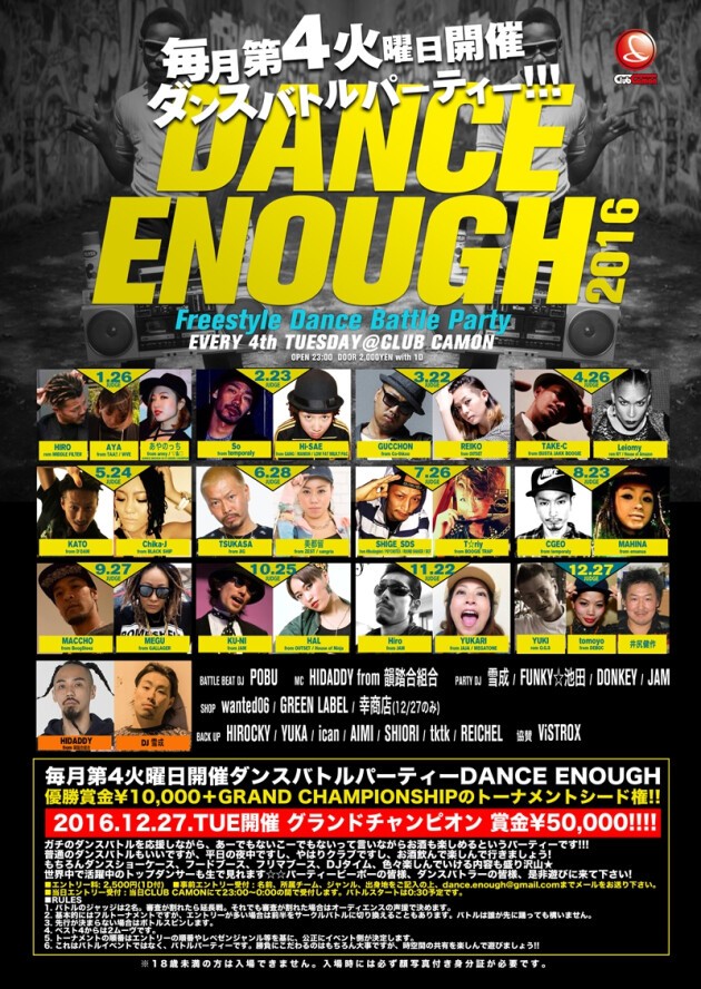 【DANCE ENOUGH 2016】6/28(火)☆毎月第4火曜はFreestyle Dance Battle Party『DANCE ENOUGH』開催★★ダンサーエントリー随時募集中!!!!バトルイベントではなくバトルパーティーです☆☆CLUB CAMONのLINE公式アカウント登録で割引特典あり★★