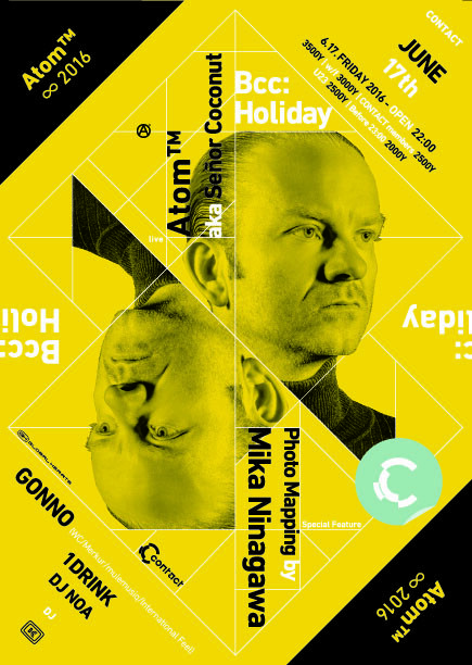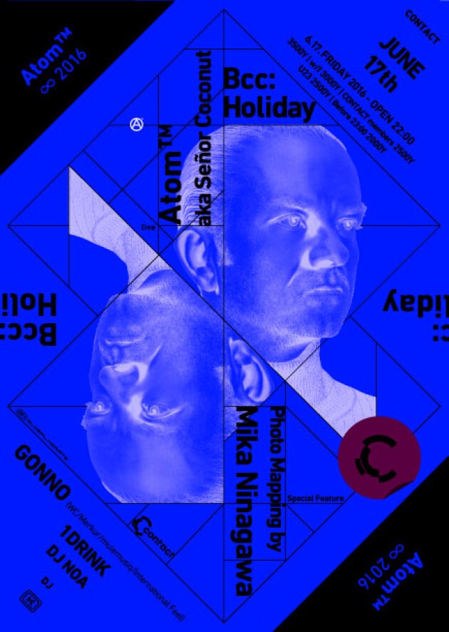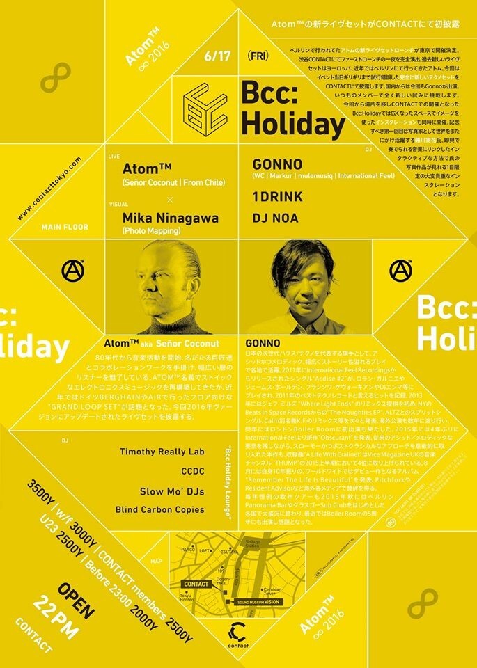 常に主流のダンス・ミュージックからは一定の距離を保ちながらも、Atom Heart、Señor Coconutといった名義でも活動し、エレクトロニック・ミュージックの多角的な表現を開拓してきたAtom ™。これまでも、彼を度々招聘してきた、新感覚の実験的パーティーBcc: Holidayが、Atom ™新たなライブセットの本邦初公開を実現。同パーティーではお馴染みとなったGonnoとDJ NOA、そしてアートに深い造詣も持つ個性派DJ 1-Drinkも参戦。さらに、世界的な写真家である蜷川実花が、この日限定の音楽にリンクしたインタタクティブなインスタレーションを制作・展示することになっており、通常のクラブ・イベントの枠を超えた、聴覚と視覚に新たなセンセーションをもたらす夜となりそうだ。