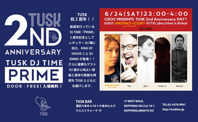 最先端のサウンドシステムとエレガントな空間を携えた六本木TUSKが2周年を記念して2日間のアニバーサリーパーティを開催!ゲストにはEMMA、REMO-CON登場!