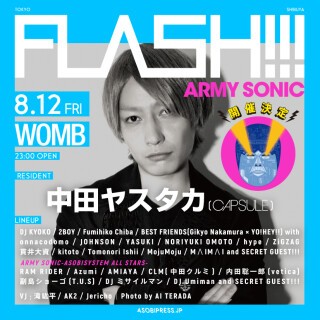 音楽家・プロデューサーである中田ヤスタカ(CAPSULE)のウィークエンドレギュラーパーティとして長きに渡りその名を轟かしている FLASH!!!。7月から WOMB のマンスリーレギュラーイベントとしてスタートし、音が止まるその一瞬まで多くのオーディエンスを沸かし続けた。出演者はパーティーの舵を取り続ける中田ヤスタカはもちろんのこと、エレクトロニックミュージックシーンの次世代を担うラインナップが集結する。そして毎年恒例、ASOBISYSTEM の BOSS である”ARMY”こと中川悠介(8/12生まれ)のバースデーを祝う ARMY SONIC が同時開催! 年に1度のこの祭典でしか体験できないコラボレーションもあるかも!? 東京代表と言っても過言ではない FLASH!!! が導き続ける今後を刮目せよ!