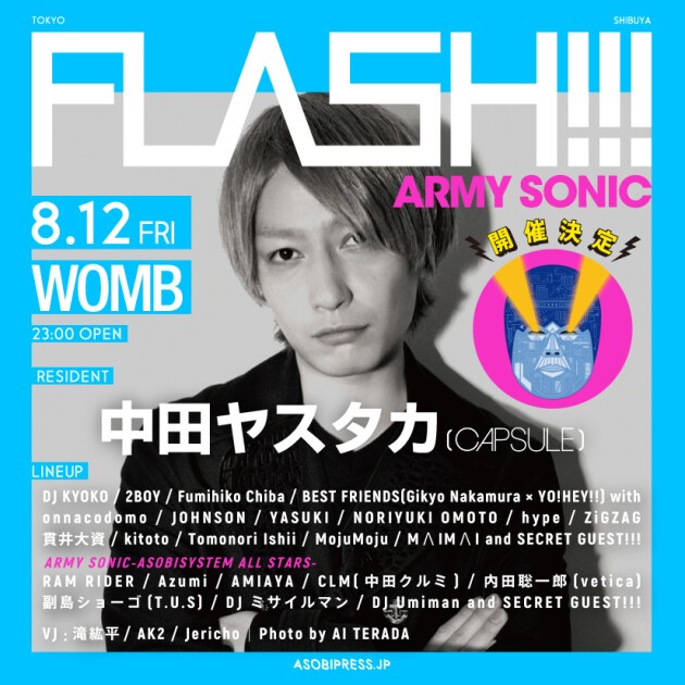 FLASH!! is a regular weekend party which found notoriety thanks to its famous resident, longtime music artist/producer Yasutaka Nakata (CAPSULE), shaking the stage nonstop and riling up crowds at WOMB as a regularly monthly event starting this last July. Performances feature not only regular headliner Yasutaka Nakata, but other forerunners of the new wave electronic music scene. This year, the BOSS of ASOBISYSTEM, Yuusuke Nakagawa (Born 8/12) AKA "ARMY" celebrates his birthday with the annual ARMY SONIC at the same time! Better yet, sources say that this birthday bash may feature a special collab performance...! Either way, it's no exaggeration to say FLASH!!! is the face of Tokyo—and it's paving the way to the future!