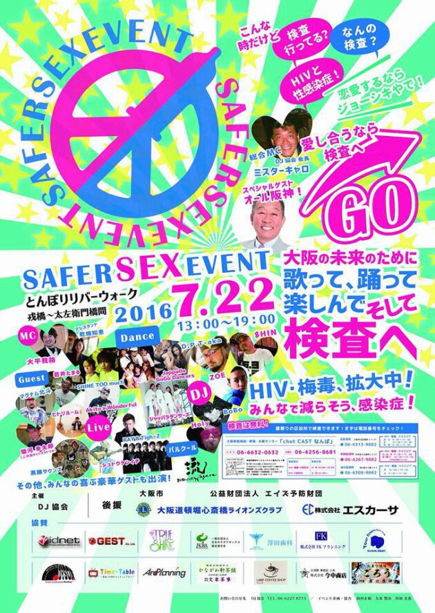 日本は先進国唯一の性感染者増加国。 この不名誉な称号を返上するためにDJ協会が主催になりセーファーセックスの啓発を行います。 DJ協会のDJたちが出演するパフォーマンスやお笑い・音楽・ダンスと通じてセーファーセックスの啓発を行っていきます。 日時 2016年7月22日(金) 13:30~19:00 場所 大阪市中央区 とんぼりリバーウォーク(戎橋の遊歩道)