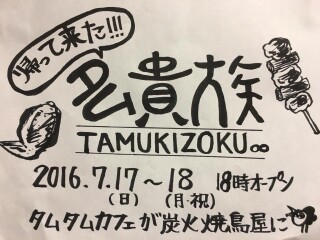 2日間限定!タムタムカフェが炭火焼き鳥屋に!期間中はクーラー掛けながらのオープンテラス営業です☆連日暑くてバテ気味かと思いますが、タレの焦げる匂いでビールが進む〜!!是非お待ちしております。前回同様DJも募集中でーす♫