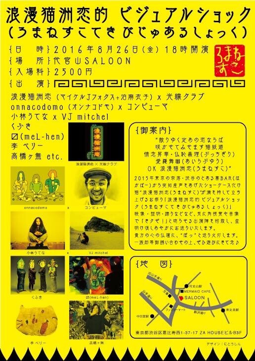 ”2015年東京の奈落・渋谷のとある墓BAR(はかばー)から突如産声をあげた“ショーケース化け猫” 浪漫猫洲恋(ろまねすこ)が満を持して立ち上げるお祭り「浪漫猫洲恋的 ビジュアルショック(ろまねすこてき びじゅあるしょっく)」。映像・照明・踊りなどなど、兎に角視覚や音像で「きクぜ!」と唸らせる出演陣を招致し、盆明け頃しめやかにお送りいたします。
