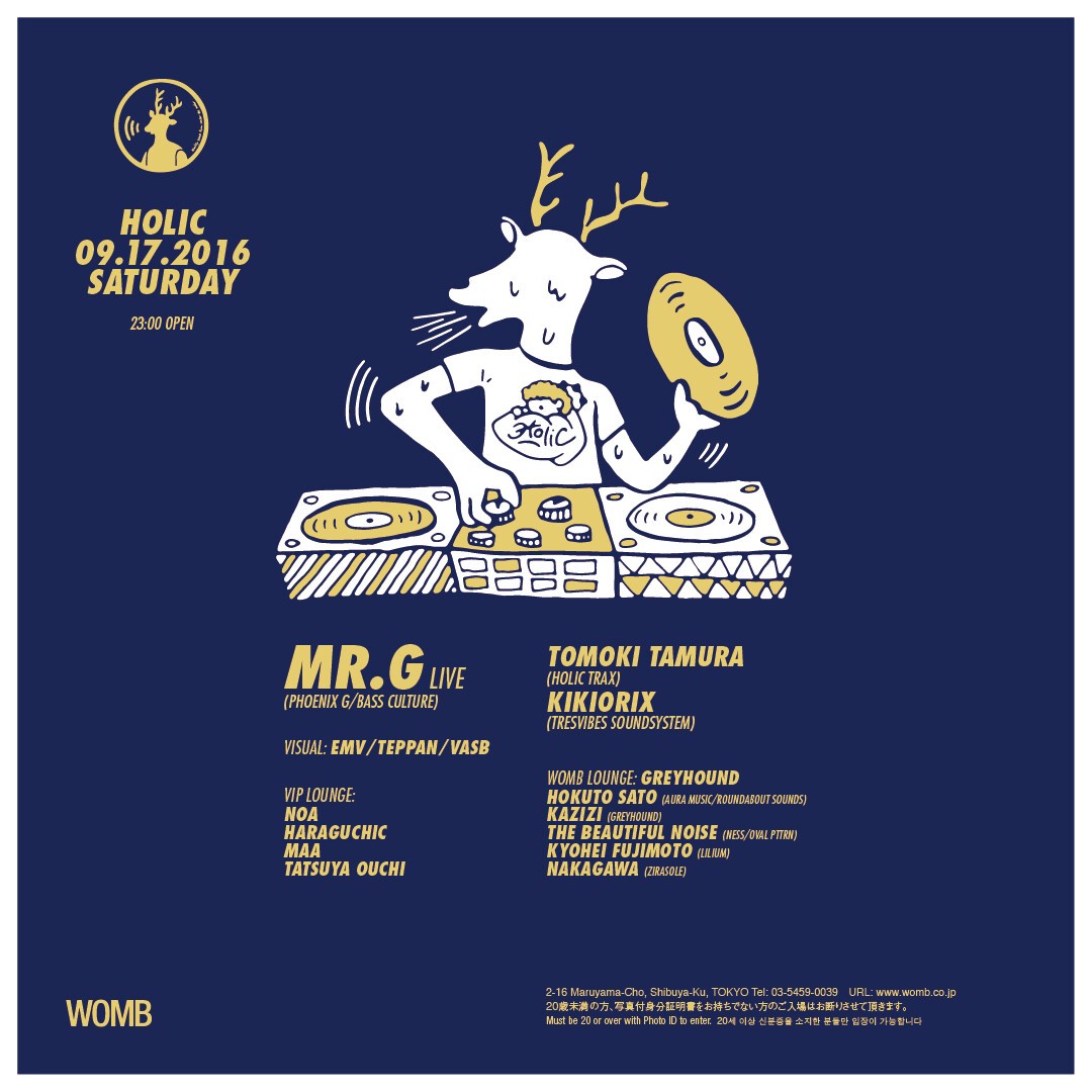 Guest artist for this event will be Mr.G, one of the scene's most important people and a key artist for HOLIC TRAX since the time that HOLIC TRAX was established. Mr.G will be returning to WOMB to play a live set for the first time in three years. Making full use of MPC, this veteran artist gets the floor explosively happening with his powerful impact and groove. His live performances are a must-see. Countering him is TOMOKI TAMURA, who has just released his own EP: “HOLIC TRAX” 020. His unique house style, which interweaves old and new house, is also something to look forward to.