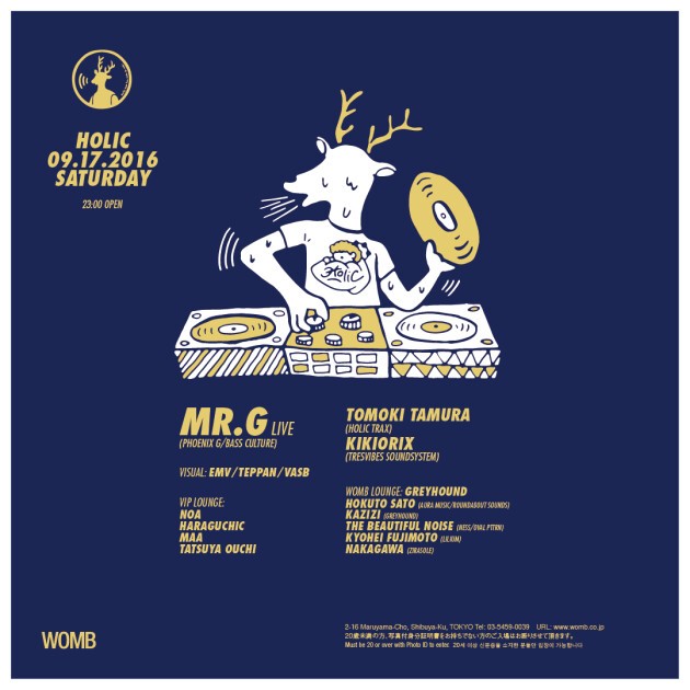 ゲストには HOLIC TRAX 設立時からのキーアーティストであり、シーンの最重要人物でもある Mr.G がライブセットで3年振りに WOMB に帰還。MPC を駆使し強烈なインパクトとグルーヴで爆発的にフロアを盛り上げるベテランのライブは必見。それを迎え撃つは、自身の EP “HOLIC TRAX” 020 をリリースしたばかりの TOMOKI TAMURA。新旧のハウスを織り交ぜ独自のハウススタイルを追求し続けるプレイにも期待が高まる。