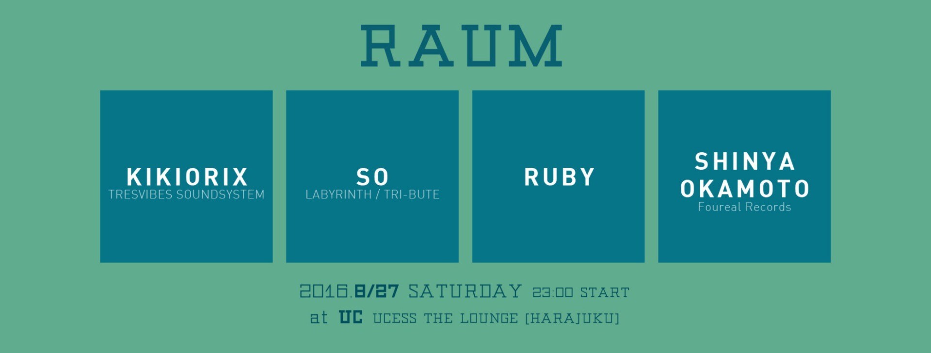 東京アンダーグラウンドシーンの最重要アイコンの一人SO、2nd Album「Ancient Signature 」リリースしアンダーグラウンドシーンにおいて着実にキャリアを積み重ねてきたRuby、レーベル「Foureal Records」のA&R、Shinya Okamoto世代を超え、各フィールドでシーンを形成してきたDJが集結しUC – Ucess the lounge にて開催。
