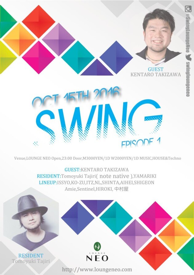 胸の高鳴り、振り子の様に永遠と横揺れを誘う音楽をテーマに、第一線で活躍している選音家達が躍動する!!!数々のSwingを世にドロップアウトし続けているクリエイターKEN ARAI、そしてNOTE NAITIVEをレジデントに迎えて、新たな章がスタートする。第一回目はBASS HOUSEの若きパイオニアKENTARO TAKIZAWAを迎えてオープニングする。