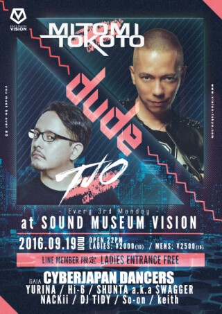 ULTRA JAPANだけに留まらず世界各国のULTRAに出演を果たしたTJOがレジデントを務め、同じくULTRA JAPAN 2016に出演のMITOMI TOKOTO、さらにはCYBERJAPAN DANCERSをゲストに迎えニューパーティー「dude」が始動する。
