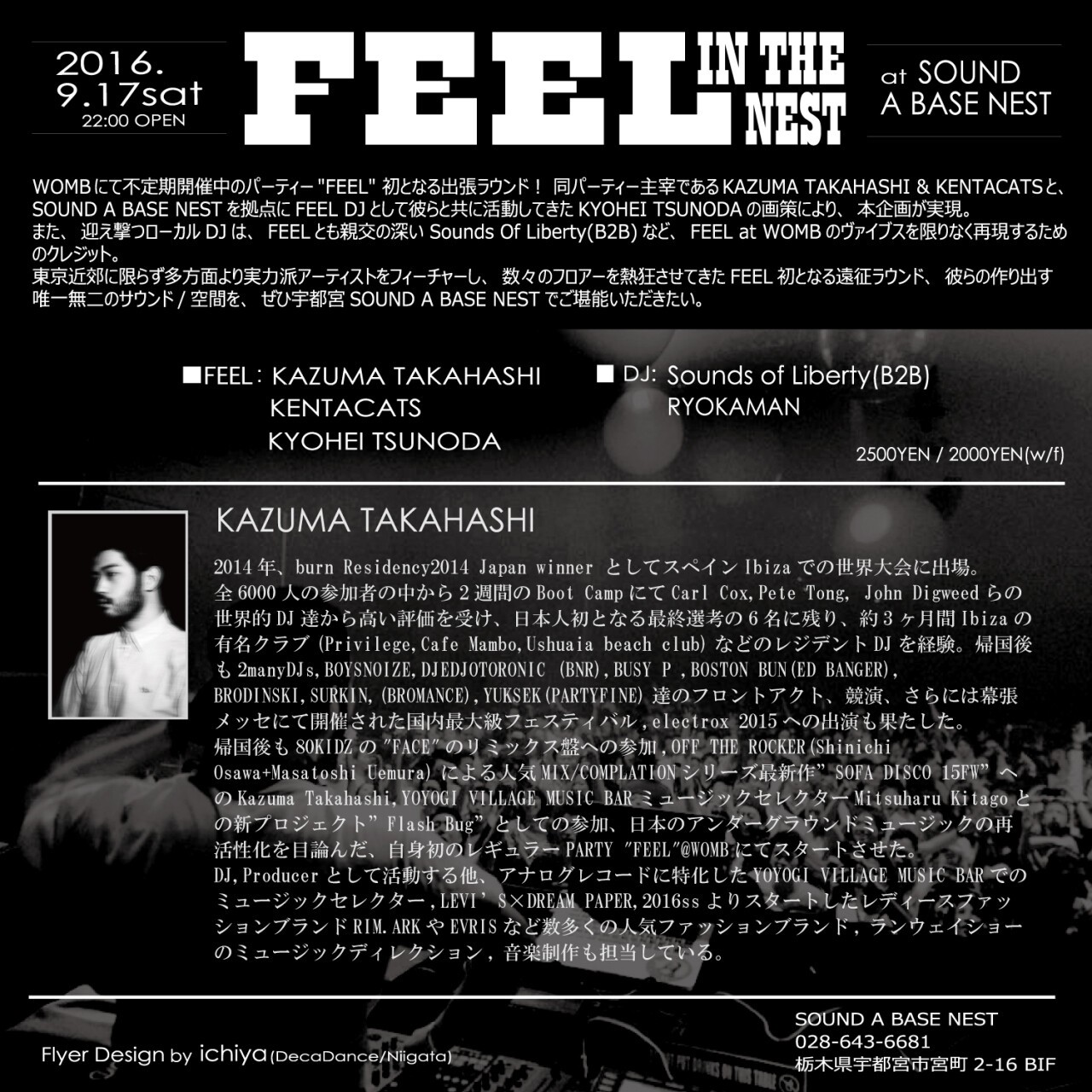 東京近郊に限らず多方面より実力派アーティストをフィーチャーし、数々のフロアーを熱狂させてきたFEEL初となる遠征ラウンド、彼らの作り出す唯一無二のサウンド/空間を、ぜひ宇都宮SOUND A BASE NESTでご堪能いただきたい。