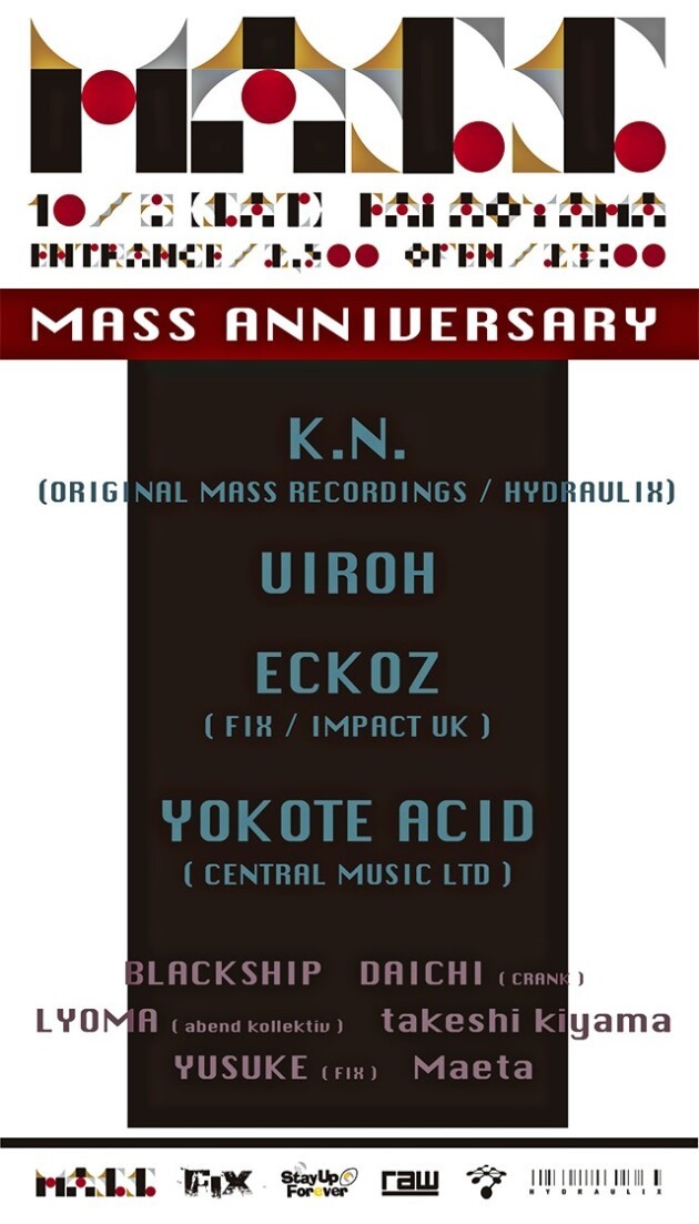 老舗テクノパーティーとしての歴史を持ち、世界レベルのハイクオリティーサウンドを存分に堪能する事のできる日本を代表する元祖 UNDERGROUND TECHNO PARTY!! 拠点を fai aoyama に移してから早1年、いよいよ MASS ANNIVERSARY 開催!