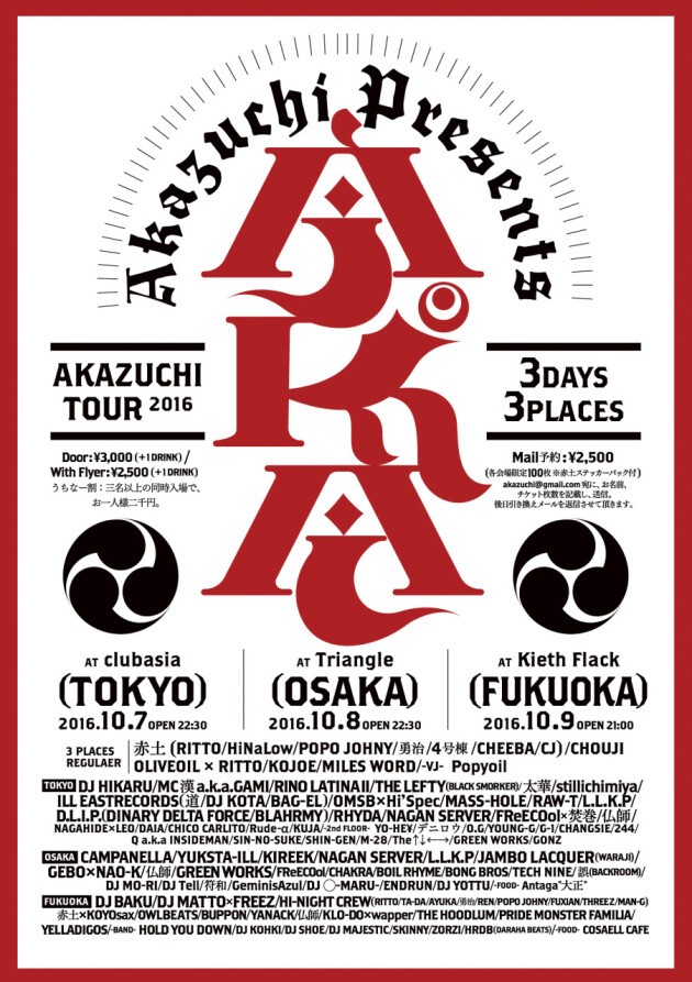 メール『 akazuchi@gmail.com 』にお名前、枚数、会場名を送ってください。