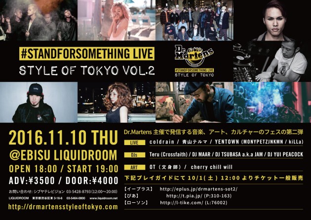 ドクターマーチンが主催する、音楽/ファッション/アートをクロスオーバーさせたイベント<#STANDFORSOMETHING LIVE “STYLE OF TOKYO”>第2弾の開催が、2016年11月10日(木)恵比寿リキッドルームにて決定。