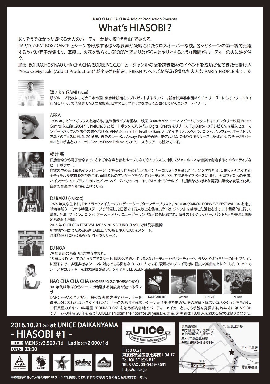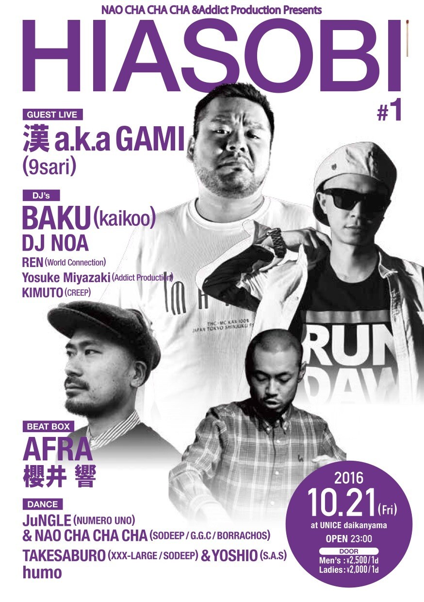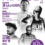 RAP/DJ/BEAT BOX/DANCEとシーンを形成する様々な要素が凝縮されたクロスオーバーな夜。各々がシーンの第一線で活躍するヤバい面子が集まり、摩擦し、火花を散らす。GROOVYでありながらもヒヤリとするような瞬間がパーティーの火に油を注ぐ。
