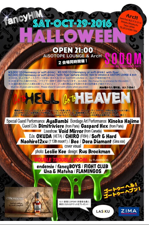 最新のダークミュージック&ダークファッションを楽しめる、クィア・ダンスパーティSODOM。今回は会場をArcHへ移し、AiSOTOPE LOUNGEで開催のfancyHIMとの地獄館・天国館の2会場同時コラボハロウィーンパーティに。スペシャルゲストには、話題沸騰のダンスユニットAyaBambiが二丁目初降臨。また、今注目のロープアーティストKinoko Hajimeもここでしか見れないスペシャルな演目を披露予定。お見逃し無く!