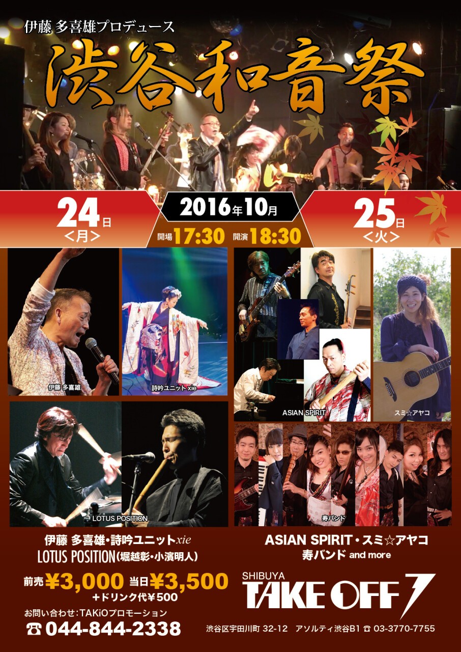 LOTTUS POSITION が遂に「渋谷 和音祭」に登場!!「和音祭」は私達の恩師、伊藤多喜雄さんが長年続けている名物ライブシリーズ。TAKiO BANDではなく、2人のユニットとして参加させて頂きます。また、今回はゲストに多喜雄さんをお迎えし「LOTUS POSITION with 伊藤多喜雄」という場面も作れそうです。是非皆さんのご参加をお待ちしております。