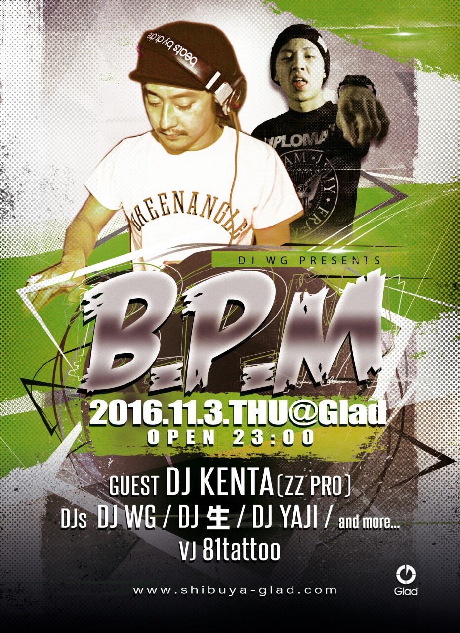 DJ WG主催2ヶ月1回に渋谷Gladにて開催の『B.P.M』!!EVERY GUEST DJとしてHipHopの競争率の高い”横浜”を中心に絶大なる支持とキャリを持つ”DJ KENTA”を迎え平日の渋谷に化学反応を起こします!都内人気大箱を中心に活躍する”DJ TSUKASA”のfeaturingやヘビー級のHipHop PARTYにて人気を誇る凄腕レギュラーDJ陣の出演により音好きのヘッズだけではなくクラブファンも来るPARTYに!!今回4周年の節目を迎え、更なる進化をし、入場無料,飲み放題のコンセプトに立ち向かい”音勝負”のPARTY!新旧問わずGOOD MUSICオンリーをお届けします!