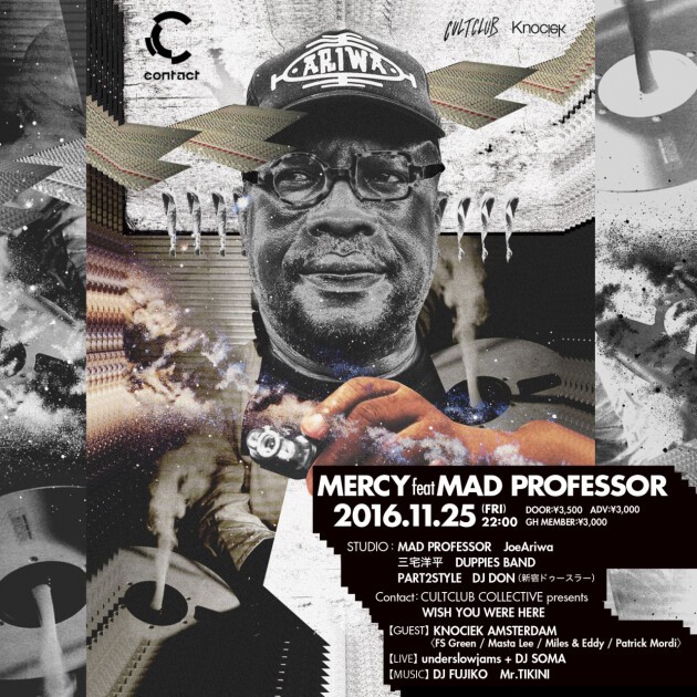 Ariwa Soundsの主宰の一人Mad Professor。UKレゲエ&ダブやラヴァーズロックを中心にリリースし、Lee "Scratch” Perry、Sly and Robbie、Horace Andy等のジャマイカのアーティストのプロデュースを手掛ける一方、Massive Attack、Jamiroquai、Depeche Mode等、レゲエのアーティストに留まらず多方面にリミックスを手掛けている。今回の来日に日本からは三宅洋平、Duppies Band、PART2STYLEなどを迎えて開催。またContactフロアの出演者にはストリートで話題のunderslowjamsや、アムステルダムからKnociek Amsterdamチームが出演。Knociek (ノキック)はアムステルダムを拠点にヨーロッパ各地で活動するチームで、メンバーはDJ/プロデューサーとして活躍するFS Green、ロンドンの新店舗をオープンしたばかりのスニーカーブティックPATTAのメディアディレクターMasta Lee、フォトグラファーPatrick Mordi 、ヨーロッパ各地で活動しているユニットMiles & Eddyを含む計8人。ダブ&レゲエに留まらないパーティ「Mercy」を体験してください。