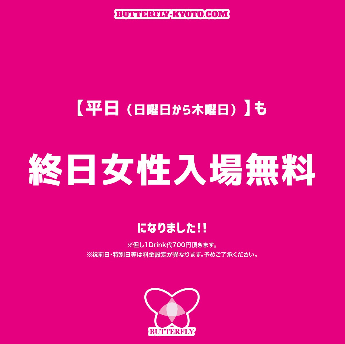 【平日(日曜日から木曜日)】終日女性入場無料!!