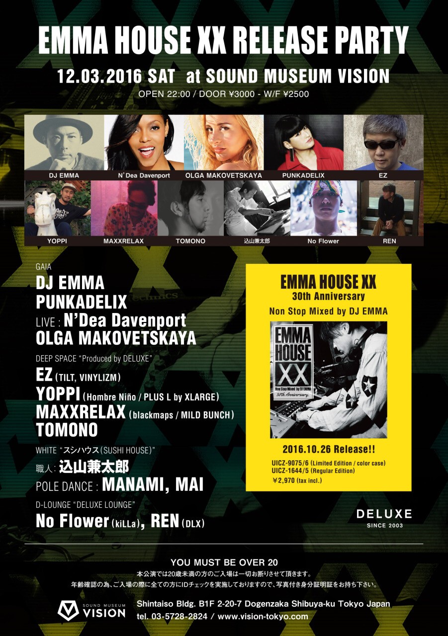 1985年よりDJを始め、東京各所のナイトクラブで数々のパーティーを成功させ永きに渡り日本のダンスミュージックシーンに多大な影響を与えてきたDJ EMMA 活動30周年を記念したEMMA HOUSE XX〜30th Anniversary Release PartyがここVISIONで開催される。常にダンスフロアとHOUSE MUSICを中心に新しい音楽を最高の技術でプレイし続けるスタイルはKING OF HOUSEと呼ばれ,日本を代表するMIX CDとなった「EMMA HOUSE」は、24bitマスタリングというMIX CDの枠を超えた徹底的な音作りとダンスフロアの雰囲気を閉じ込めた作品として好セールスを記録しこの度20枚目のリリースとなる。