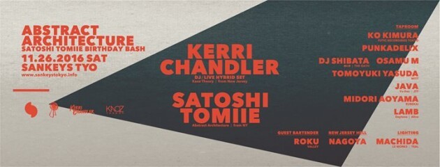 Sankeys TYOにまた1人ビッグネームが登場する。現在もなおシーンのトップに君臨する重鎮、ディープハウスのオリジネーターKerri Chandler。ハウス・ミュージックというジャンルに於いては勿論の事、テクノ方面からも支持されるエレクトロニックで硬質なトラックに心温まるエモーショナルなメロディーや歌を絡ませたその手腕は、これぞデジタル・ソウルと呼ぶに相応しい。また古典的な音楽性に留まる事なく最新テクノロジーをも駆使した楽曲性やDJプレイには、オープンマインドな精神性を伺えるなど、ハウス・ミュージックの過去と未来を紡ぐアーティストである。そして、もう一人、ハウスミュージックのゴッドファーザー故Frankie Knucklesに才能を見出されてデビューしてから永くグローバルシーンの最前線で活躍してきた、日本が世界に誇るアーティストSatoshi Tomiieも登場する。この夜は彼のバースデイバッシュを兼ね、TAPROOMには記念日を祝福するアーティストたちが集結する。オープン~ラストまでKerriとTomiie、二人のみで挑む至極の音空間を、心から味わい尽くしてほしい。