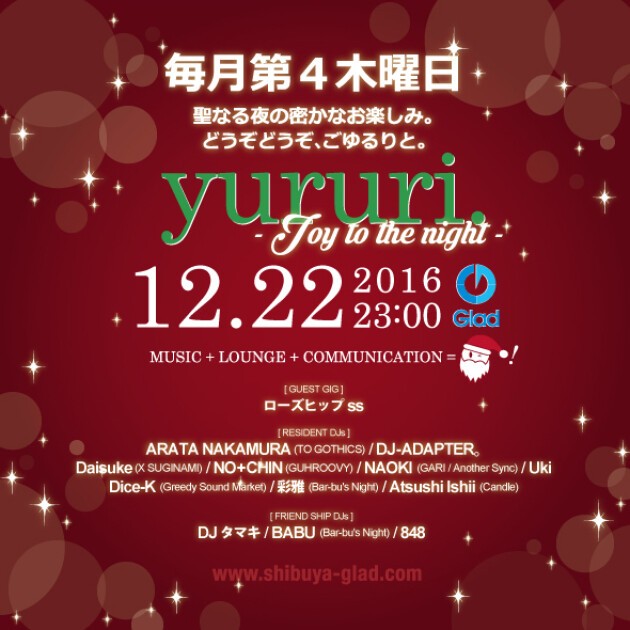 代表者のお名前(カタカナフルネーム)、メールアドレス、ご希望枚数を明記の上、件名【12/22(木)yururi予約】にてメール送信してください。