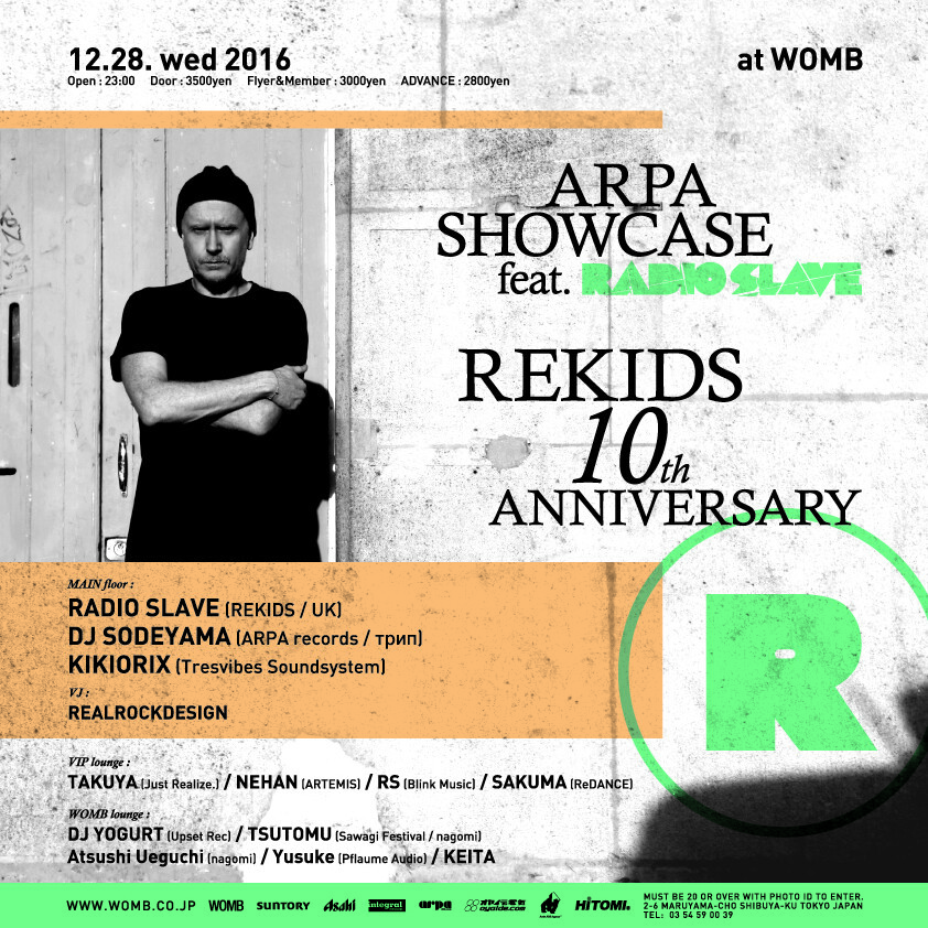 RADIO SLAVE, who is close friends with DJ SODEYAMA and his remixes have been composed for ARPA records among other things, has been holding parties all around the world and his own label, REKIDS is in its tenth year. Now, he is making a return to ARPA SHOWCASE once again. In addition to these two who have performed together over many years in Japan, KIKIORIX who is also deeply involved with ARPA records will be performing. At WOMB LOUNGE, DJ YOGURT will take center stage with TSUTOMU presided over by SAWAGI fes on the side. At the VIP LOUNGE, TAKUYA, NEHAN, RS and SAKUMA will perform with a wide range of musicality. Please come to the first ARPA SHOWCASE held in a while, with a lineup worthy of the year's end.