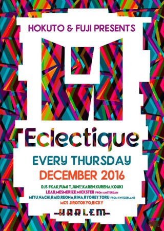 DJ HOKUTOが5年に渡り毎年2回のヨーロッパツアーを敢行する中で、アムステルダムで出会った今までのDJの常識を覆すDJスタイル“Eclectic”。そして、音楽のメッカヨーロッパで毎夜繰り広げられる、自由な音楽感と遊びのスタイルに衝撃を受け、そのパーティ感とDJスタイル再現するパーティとしてスタートしたのが『ECLECTIQUE』。