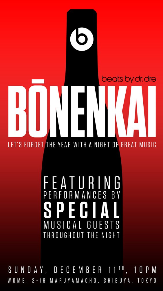 前代未聞の忘年会が、来週日曜日WOMBにやってくる!Dr. DreとJimmy Iovine(ジミー・アイオヴァイン)によって2006年に設立された、世界をリードするオーディオ・ブランド・『Beatsby Dr. Dre(ビーツ・バイ・ドクタードレ 以下、Beats)』は、記念すべき10周年の締めくくりに、普段からBeatsをご愛用頂いている皆様への感謝の気持ちを込めて、12月11日(日)に、東京・渋谷のクラブWOMBで『The Official Beats Bonenkai Party 』と称したYear End Partyを盛大に開催いたします。