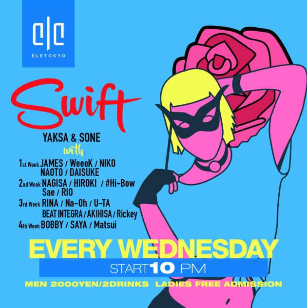 ELE TOKYOのレジデント陣を中心に、最先端のダンスミュージックにBASS MUSIC、HIP HOPを織り交ぜた 週末とはひと味違ったグルーヴィーな空間をお楽しみいただけます。