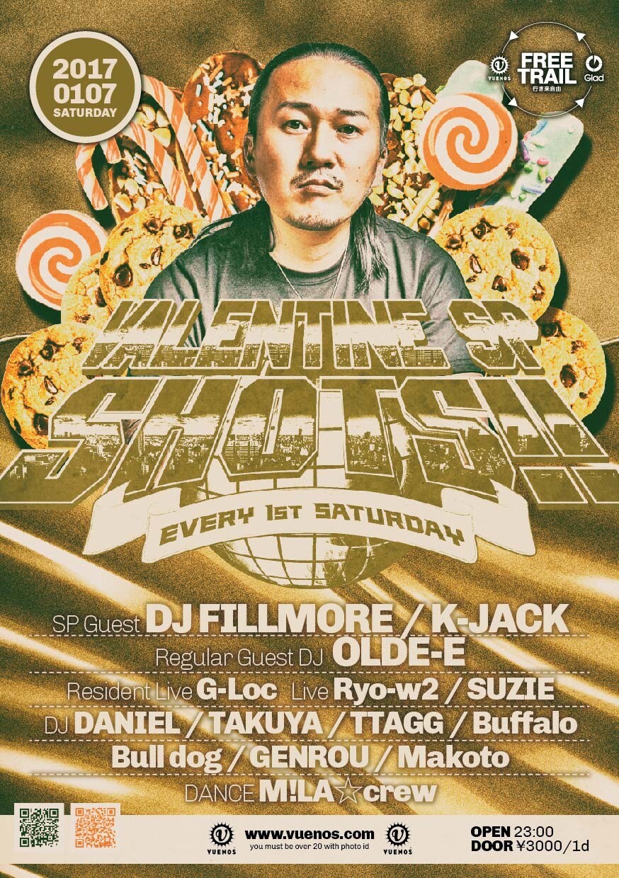 伝説のクラブ“VUENOS TOKYO”が閉店後、 始まったDJ OLDE-E (NAGOYA) のレギュラーゲストパーティー「SHOTS!!」が5年目に突入!! DJ OLDE-Eもスクリーンを使い、音と映像がリンクする「VDJ」とマイクパフォーマンスでVUENOSを盛り上げます! 東西のリアルHIP HOPを織り交ぜ、初心者から玄人まで誰でも楽しめるONE AND ONLY PARTY!! プレイ中には、振る舞いテキーラが飛び交い、パーティーモード全開! 最先端のHIP HOPをチェックしたければ、SHOTS!!で决まり!!