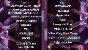 LINE UP: DJ KYOKO, 2BOY, FUMIHIKO CHIBA, BEST FRIENDS (GIKYO NAKAMURA × YO!HEY!) with onnacodomo, JOHNSON, YASUKI, NORIYUKI OMOTO, HYPE, ZIGZAG, たくま, BEAAT, 貫井大資, KITOTO, DIORA, MOJUMOJU, MΛIMΛI, MAREAM AND MORE