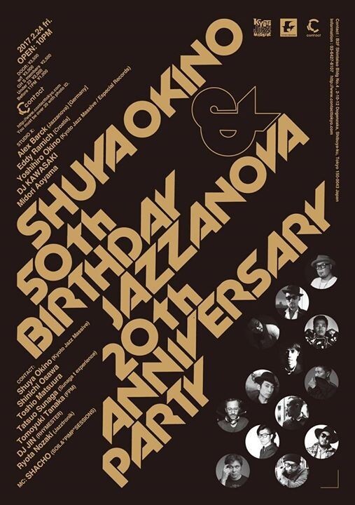 選曲家、作曲家、執筆家、そして現在華道家を目指して修行中でもある沖野修也の50歳の誕生日会を開催!常に新しい提案で話題を振り巻き、世間を騒がせて来た音楽界の重鎮が、渋谷Contactにて人生の節目を迎えます。そして、沖野修也に所縁のある豪華なゲスト陣、大沢伸一(Mondo Grosso) 、田中知之(FPM)、松浦俊夫、須永辰緒、DJ JIN(RHYMESTER)、野崎良太(Jazztronik)、社長(SOIL&”PIMP”SESSIONS)、沖野好洋(Especial