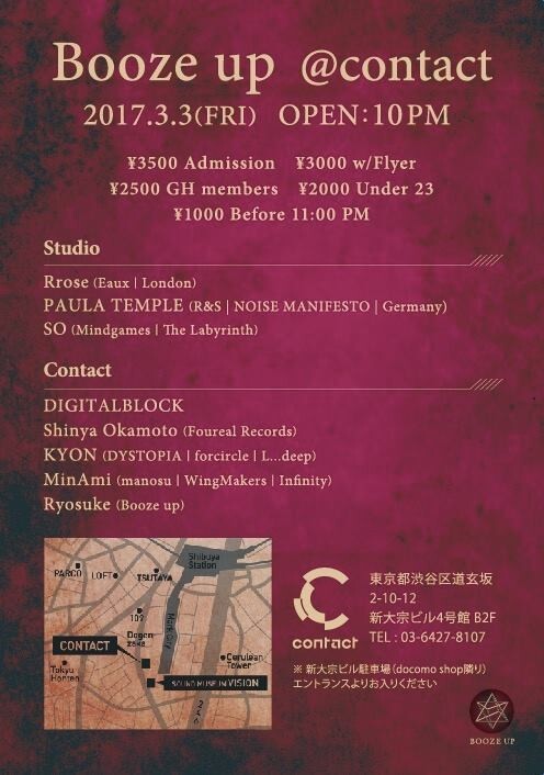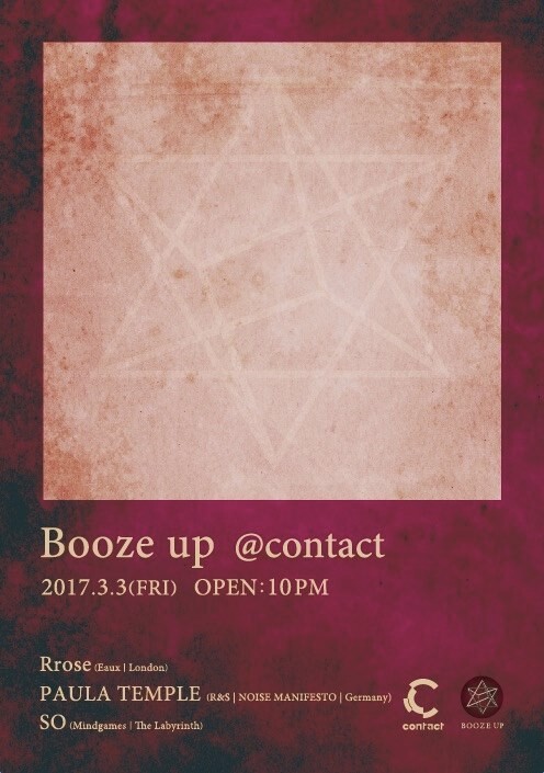 東京を拠点に開催されてきたBooze upが、2017年初開催のゲストに、2010年以降のテクノシーンにて前衛的な側面を担ってきた2人の鬼才をゲストに招く。1人目は、Sandwell Districtからシーンへと出現して以来、常に鮮烈な印象を与え続けているRrose。テクノのルーツに則りながらも、ノイズやドローン、インド古典音楽などを吸収した音像がこれまでも数多のリスナーを虜にしてきたが、2016年にLucyやKangding Rayとの共作を経てさらなる進化を見せている。もう1人のゲストには、〈R&S〉のテクノサイドの看板を務めるPaula Templeが登場。デビュートラックがJeff MillsのDVDで使用されてから約10年振りの2013年に最前線へ復帰し、スリリングで硬質なテクノサウンドと卓越したパフォーマンスでここ数年再び注目を集めている。2人は今年すでに、Paula Templeの主宰レーベルNoise Manifestoが発表しているコラボシリーズにて共演済。想像以上に密度の高い一夜が展開されるだろう。国内からはTHE LABYRINTHのレジデントDJであるSOがメインフロアをサポートし、ContactフロアからはDIGITALBLOCKのオーガナイザーDJチームやShinya Okamotoが空間を守り立てていく。
